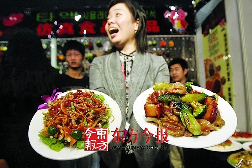 紅燒肉、炒河粉、烤雞翅……這些“菜肴”看得人垂涎欲滴,要不是上面拴著鑰匙鏈,去參觀的人恐怕要夾起一筷子嘗嘗了。其實,這些都是仿真食品模型,但做得太像了?!澳憧催@燒雞,還能看見雞身上沒去凈的‘毛’,太像真的了?!币粋€盤子里放的仿真燒雞,不斷有圍觀者拿在手里端詳,有些小朋友拿起“燒雞”就往嘴里塞?!斑@些仿真食品都是根據(jù)實物制作而成的?!币幻ぷ魅藛T介紹說,配料多的“菜”,得一塊一塊地燒制,然后粘到一起。